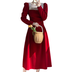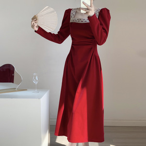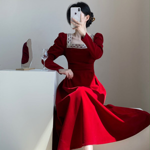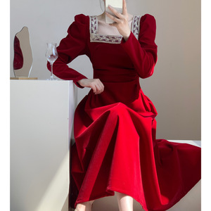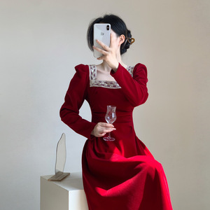 2023秋冬フランス式ヘボン風レトロな赤い中長タイプのベルベットが婚約した花嫁ドレスのワンピース女性