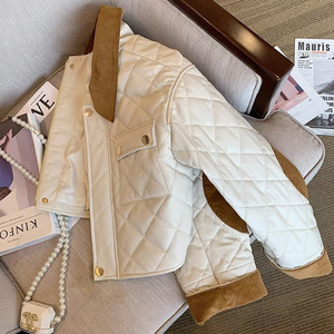 现货棉衣白色菱格灯芯绒拼接小香风棉服外套女秋冬新款时髦复古短