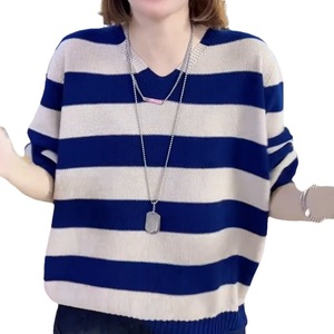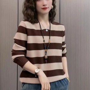 長袖のセーターの女性の早秋の新型のファッションのゆったりしているストライプのニットは年齢を減らして明らかにやせているvネックのニットのお母さんのシャツを現します。