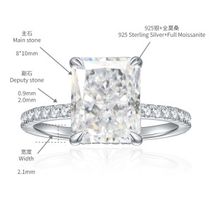跨境独立站热卖冰花切莫桑石长方8*10mm4克拉订婚戒指S925银镀18k
