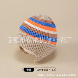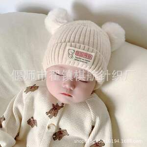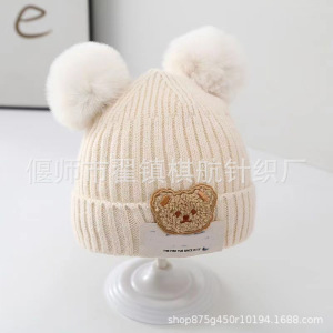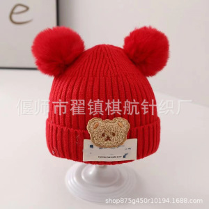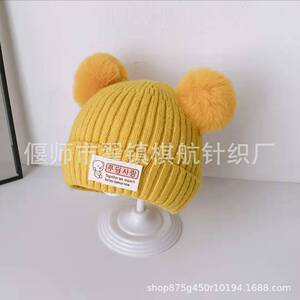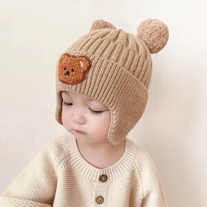 秋の冬の太線ニット帽の新型かわいい熊の男女の赤ちゃんの冬のベルベットの毛糸の帽子は耳の子供の帽子を保護します。