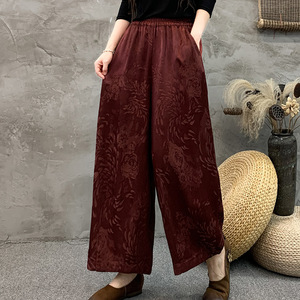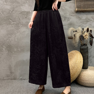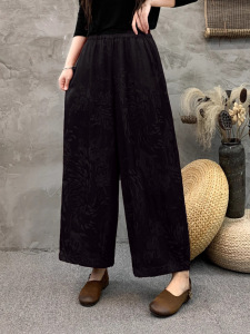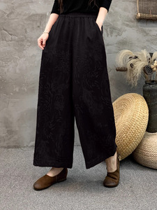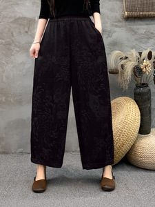 秋のサテンジャカードストレートパンツ、中国風ルーズフィットレディースレーヨン暗色柄アート風裾上げ九分丈パンツ