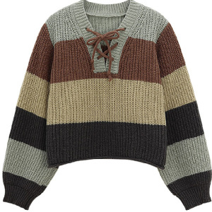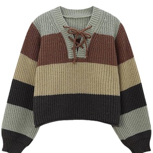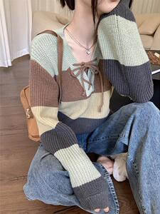 レトロな衝突色のストライプのストラップvネックのニットの底のシャツの女性の秋冬のストラップの怠惰な上着の短いセーターの中で合わせます。