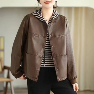 古茶色の服 秋の新作 レディース レザージャケット 黒のトップス おしゃれ カジュアル ゆったりとしたステッチ入り アート風PUレザージャケット