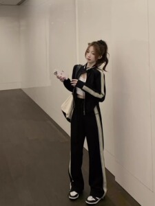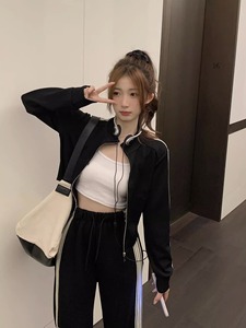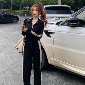 大きいサイズの太ったmmギャルの短いコートの上着の女性の秋のスーツの運動の腰が高くてやせている2つのセットの200斤の300