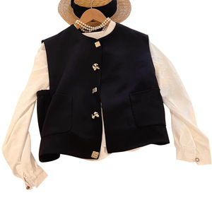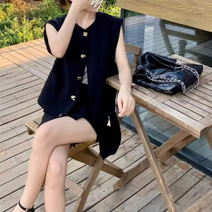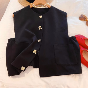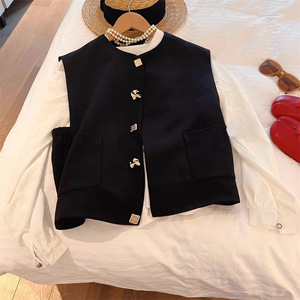 現物の金属ボタンの黒いベストの女性の秋の新型のデザイン感の雰囲気の小さい香りの風の袖なしのベストのスーツ