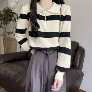 ストライプの半ファスナーのpolo襟のプルオーバーのセーターの女性の高級感は秋冬の中にゆったりとしたニットの上着を着ます。