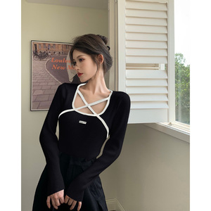 セクシーな方襟交差長袖修身セーター2023秋冬の新しいシャツの縞模様のニットの上着