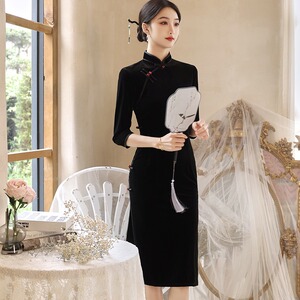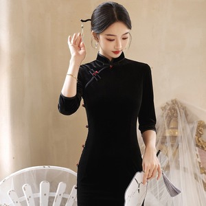 聚鳳軒のハイエンドの金のベルベットのチャイナドレスの秋のワンピースの金のベルベットの新型の日常のショーは優雅できちんとしています。