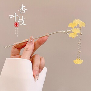 75 # 黄色杏葉枝流蘇ヘアピン-金色 (袋入り)