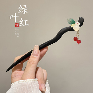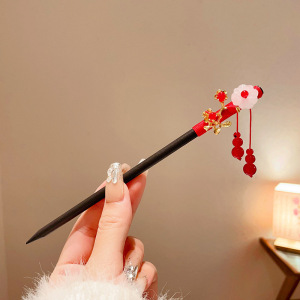66 # 緑の葉のウサギのフリンジの赤い玉のかんざし (袋入り)