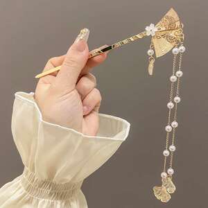 73 # 三花ドリル真珠金叉流蘇ヘアピン-金色 (袋入り)