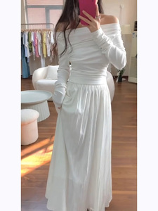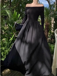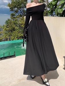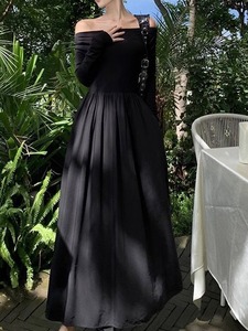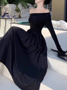 2023フランス式の肩の長袖のワンピースの女性の早秋の中で小さい黒いスカートの気質の肩を現して腰を収めてやせている長いスカートを現します。