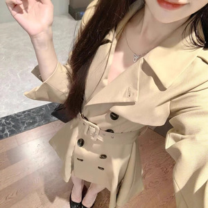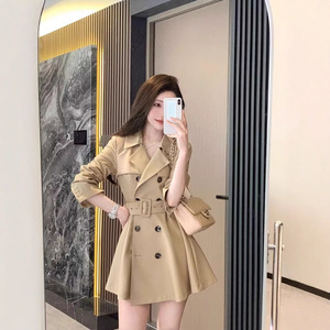 女性用カーキトレンチコートドレス、秋の高級感溢れる長袖スカート、ダブルブレストウエストデザイン、Aラインショートスカート