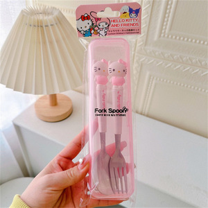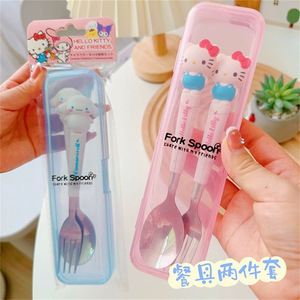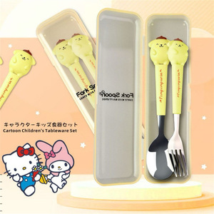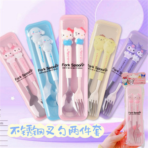 日系かわいいスプーンフォーク2点セットステンレス食器携帯学生サラリーマンが昼食食器箱を持っている