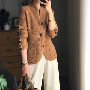 高級中国式女装復古風秋冬にウールカーディガンの立襟セーターのニットのゆるいコートの女性を厚くする