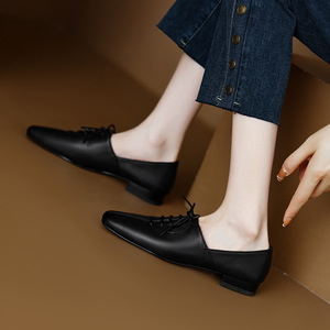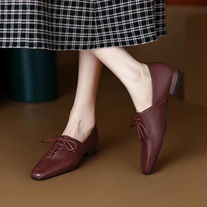 四角い口の深い口のひもの低い靴の女性の秋の気質の名媛の太さと本革の柔らかい皮の靴の復古の平底の靴