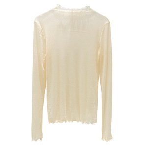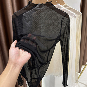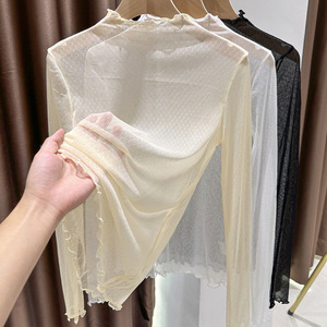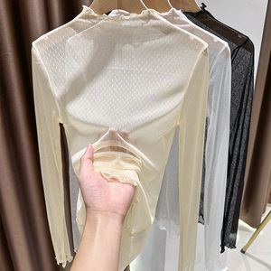 半高襟レースの底のシャツの女性の春と秋の空気の中に透明な網の紗の長袖の紗の服の木の耳元の薄い紗の上着を掛けます。