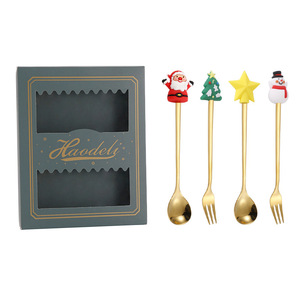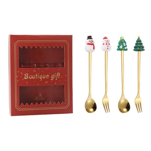 2スプーン2フォーク-緑箱 (サンタクローススプーン + 小木フォーク + 星スプーン + 帽子をかぶった雪だるまフォーク)