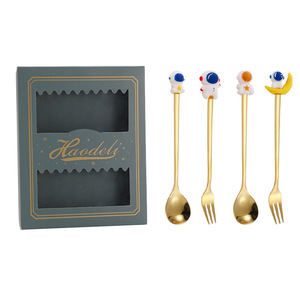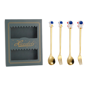 2スプーン2フォーク-グリーンボックス (宇宙飛行士スプーン + 黄宇宙飛行士フォーク + 月宇宙飛行士スプーン + ロケットフォーク)