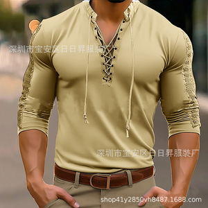 2023アマゾン男性メッシュ布長袖ヘンリーシャツ純色系襟上着カジュアルシャツ上着