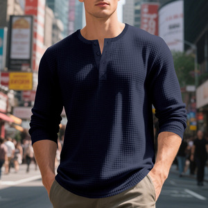 2023秋冬越境小方眼運動修身通気性メンズ長袖tシャツ欧米メンズカジュアルヘンリーシャツ