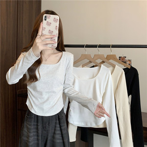 雰囲気の新しい秋の服の中には方襟の底のシャツの女性の服のデザイン感の上着の長袖の肩のtシャツの女性のタイプがあります。