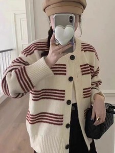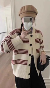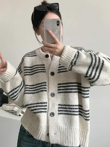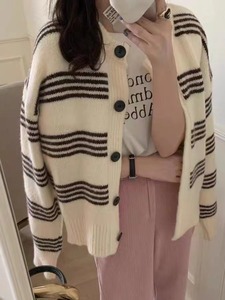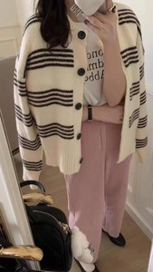 韓国系のデザイン感は色のストライプのニットのカーディガンのコートにぶつかります。