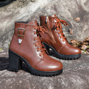 2025年秋冬新作 ラウンドトゥ レースアップ マーティンブーツ レディース ブリティッシュスタイル ベルトバックル サイドジッパー ハイヒール ショートブーツ