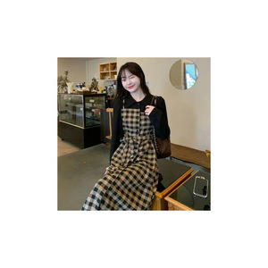 2025春秋新作 太め体型向け ヴィンテージ風チェック柄 フェイクツーピース おしゃれで万能 若見えワンピース 小柄さん向け 長袖ワンピース
