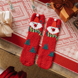 クリスマスの靴下の子供の珊瑚の絨毯の秋冬のカップルの親子はプレゼントをあげます。