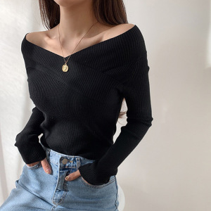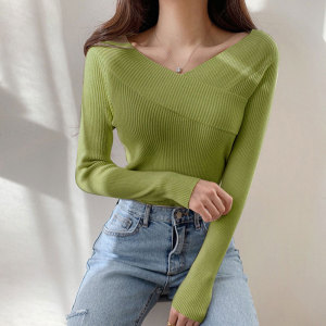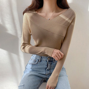 肩の純色の修身の中にvネックの肩のニットの秋冬のセーターの女性を掛けて長袖の上着の卸売りをします。