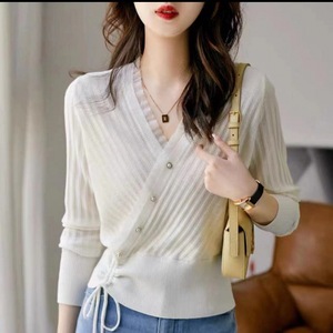 レディースセーター2025新作春秋ドローストリング斜め前立てフリルVネック長袖ニットセーター
