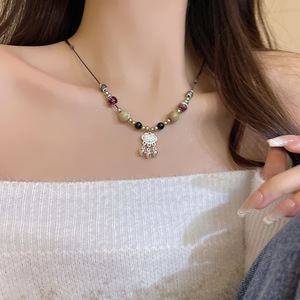 新中国式レトロ陶磁器数珠ネックレス女性禅意風百合漢服編み縄首鎖爆金個性装飾