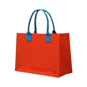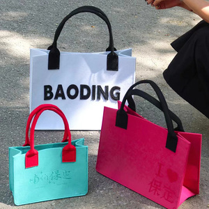 フェルトは色のアルファベットにぶつかって外に出ます。手提げ袋を持っています。