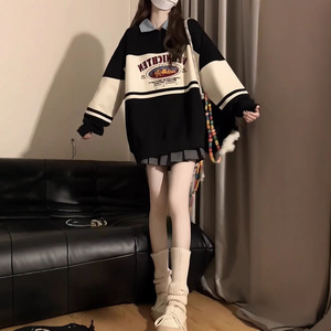 ヒップホップ配色ポロ襟ハーフジップスウェットシャツ レディース 春秋 フードなし 裏起毛トップス クール系 韓国風 カジュアル