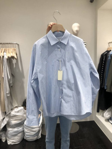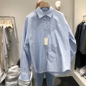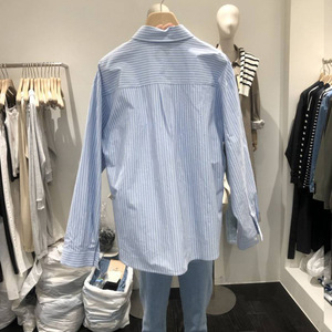 韓国の東大門の大衆の気質は襟をひっくり返してストライプのゆったりしていて痩せている長袖のシャツの女性の上着の韓系の婦人服を結びます。