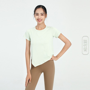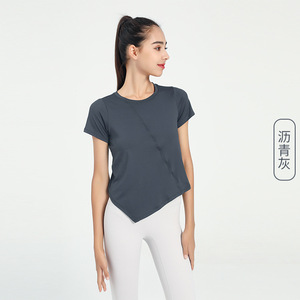 欧米のスポーツ上着の女性のゆるい速乾ヨガの半袖のランニングのブラウスのフィットネスの服のtシャツの不規則なネットの赤