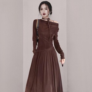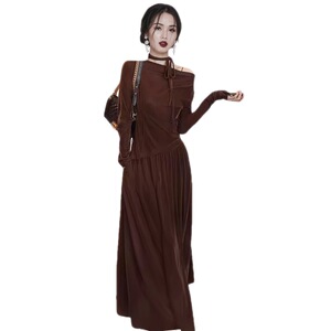 御姐範気質ベルベット2点セット越境女装秋新ファッション一字襟上着 + 高腰大振り子スカート