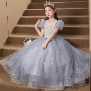 青い子供のドレスの王女のスカートの2024洋風の詩は小さい司会者のピアノのショーのショーのドレスのスカートを朗読します。