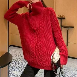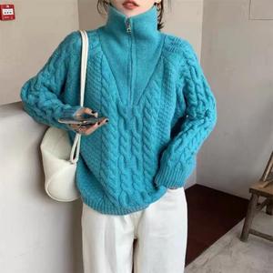 ファッション麻花高襟ニット女性秋冬新作韓国版怠惰風半ファスナーゆるいセーターコート女性