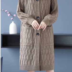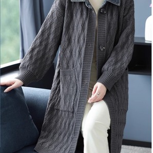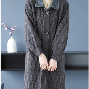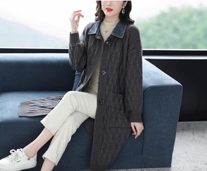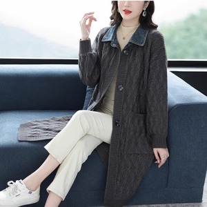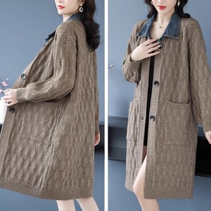 デニムの襟のカーディガンの女性の中の長いセーターは秋冬の膝のコートをニットします。