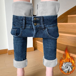 ベルベットジーンズ女性秋冬双ボタン高腰弾力修身保温九分青灰色鉛筆小足ズボン