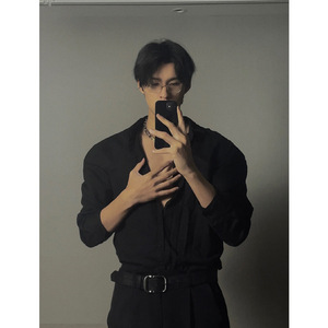 黒の肩パッドシャツ男性高級感ナポリシャツ禁欲系男性服男性カジュアルコート