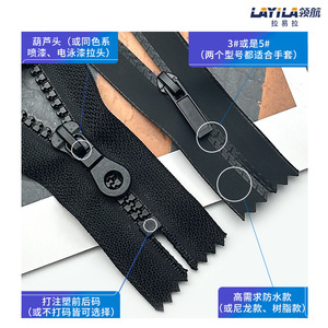 手袋ファスナー防水アウトドアタイプ長さカスタム工場卸売り黒葫芦頭5号樹脂無尾ファスナー
