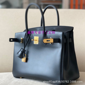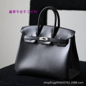 鑫豪華家純手作りワックス糸BKプラチナバッグ30cm黒色光沢面BOX革ハンドバッグ本革女性バッグ