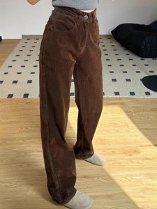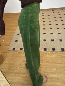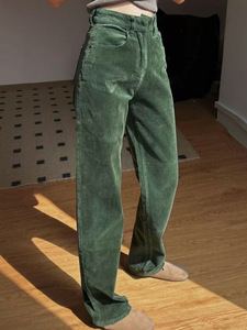 2024春秋人気商品 草緑色コーデュロイワイドパンツ レディース レトロハイウエストロングパンツ カジュアルロングストレートパンツ