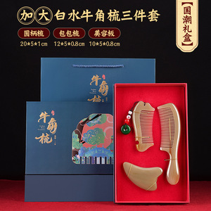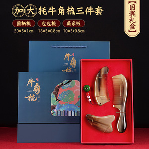 【中華風ギフトボックス】特大白水牛角20cm丸柄コーム+12cmクジラコーム+10mm削り板+手提げ袋