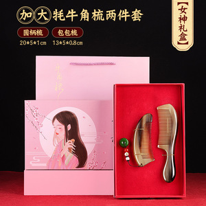 中国風ギフトボックス】ヤク角拡大20cm丸柄コーム+13cmイルカムーンコーム+掻き板+安全バックルペンダント+ハンドバッグ【無料ハンドバッグ】
