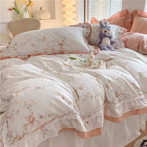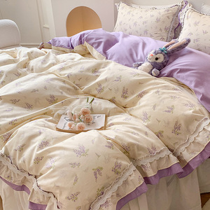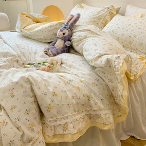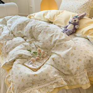 100%純綿ベッド4点セット、田園風花柄、2025年製、掛け布団カバー、春夏用ベッドスカート、黄色の田園風